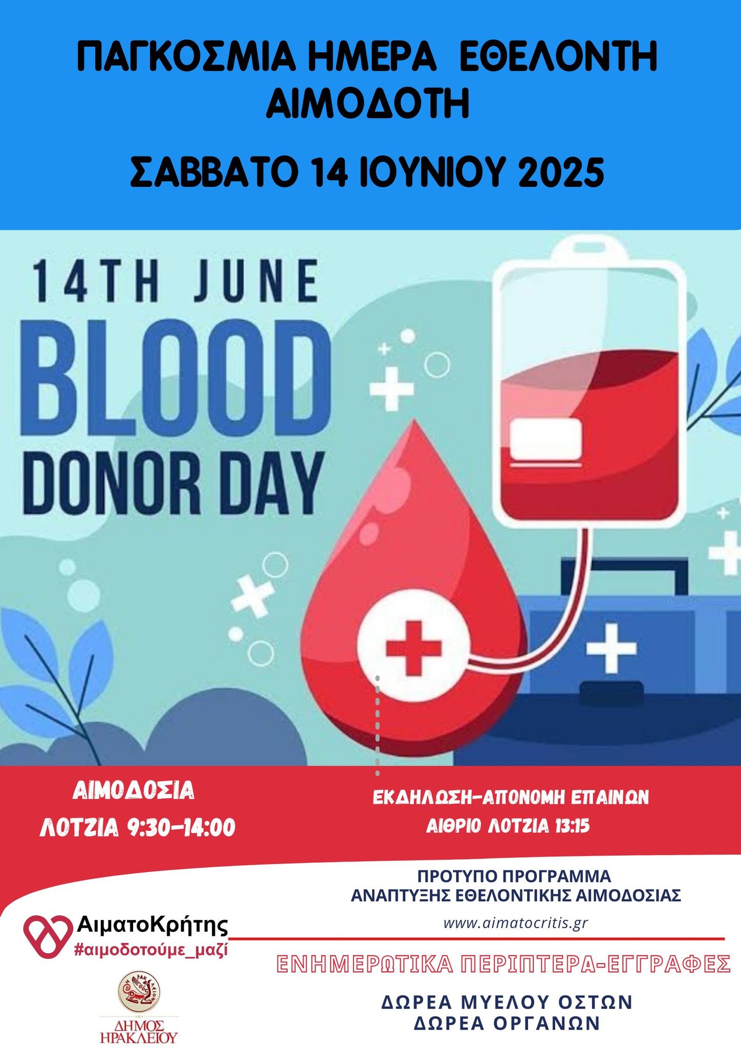 Με αφορμή την Παγκόσμια Ημέρα Εθελοντή Αιμοδότη οι εθελοντές και το Διοικητικό Συμβούλιο του Παγκρήτιου Συνδέσμου Εθελοντών Αιμοδοτών «Αιματοκρήτης» σας καλούν στην εορταστική εθελοντική αιμοδοσία που θα πραγματοποιηθεί το Σάββατο 14 Ιουνίου 2025 στο αίθριο Λότζια από τις 9:30-14:00.