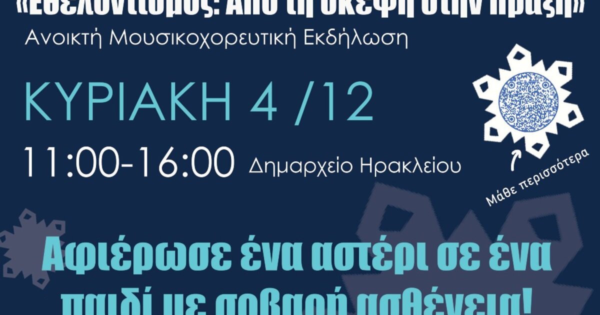 Την Παγκόσμια Ημέρα Εθελοντισμού, στις 5 Δεκεμβρίου, γιορτάζει ο Δήμος Ηρακλείου και η Αντιδημαρχία Εθελοντισμού, Νεολαίας, Οργάνωσης και Ολοκληρωμένης Διαχείρισης Επιπτώσεων Κατάστασης Έκτακτης Ανάγκης με τη διοργάνωση δύο εκδηλώσεων στο πλαίσιο της δράσης «ΕΘΕΛΟΝΤΙΣΜΟΣ: ΑΠΟ ΤΗ ΣΚΕΨΗ ΣΤΗΝ ΠΡΑΞΗ».