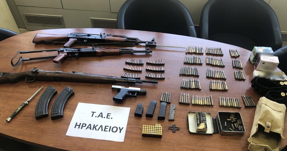 Σε περιοχή του Δήμου Αχαρνών - Αστερουσίων συνελήφθη το πρωί, από αστυνομικούς του Τμήματος Αστυνομικών Επιχειρήσεων Ηρακλείου, ένας Έλληνας, κατηγορούμενος για παραβάσεις της Νομοθεσίας περί όπλων . Βρέθηκαν και κατασχέθηκαν, μεταξύ άλλων 2 καλάσνικοφ, πολεμικό όπλο και πιστόλι
