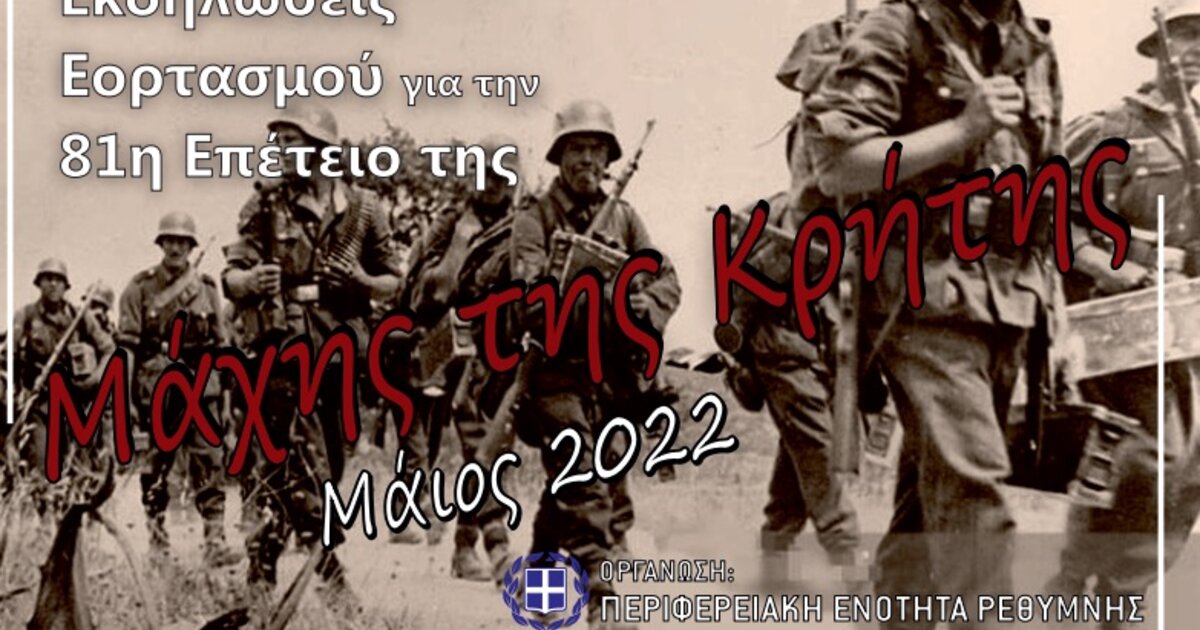 Ώρα 08:30 Εορταστικές εκδηλώσεις - ομιλίες στα σχολεία της Πρωτοβάθμιας & Δευτεροβάθμιας Εκπαίδευσης για τη σημασία της Μάχης της Κρήτης τις δύο (2) πρώτες ώρες. Τα μαθήματα θα συνεχιστούν κανονικά μέχρι το πέρας του ωραρίου.