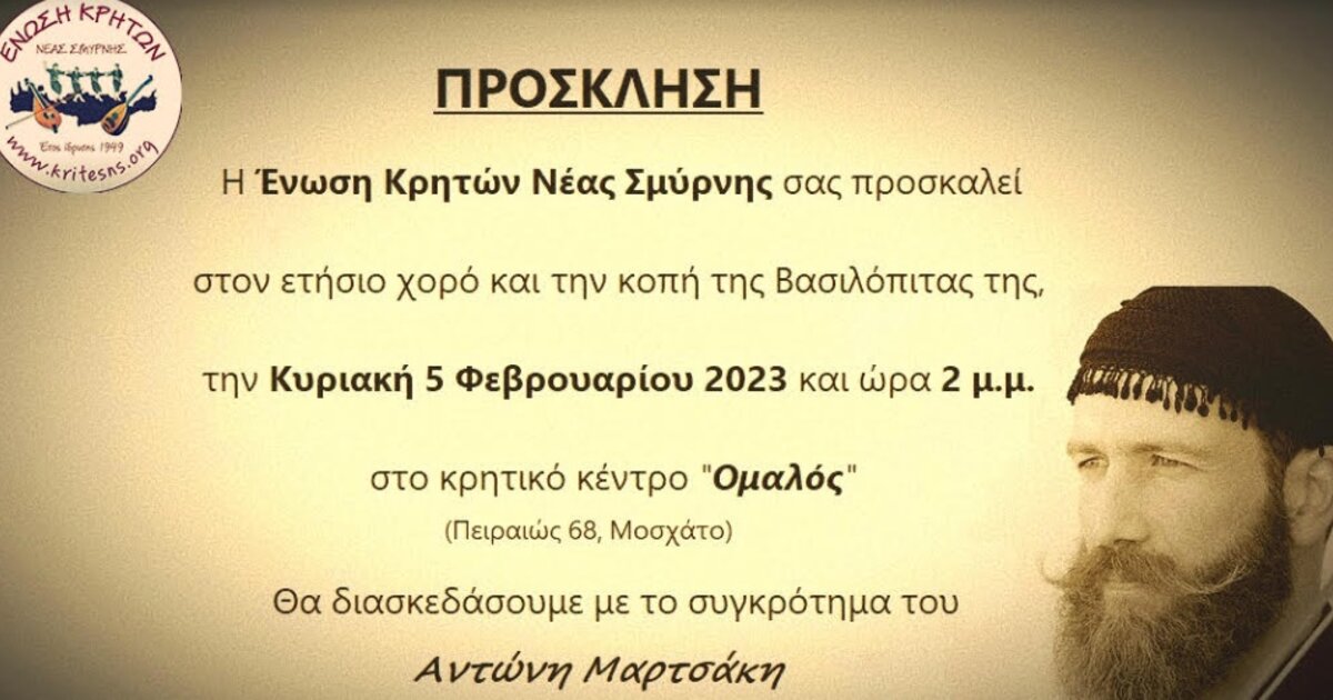 Στις 5 Φεβρουαρίου αναμένεται να πραγματοποιηθεί ο ετήσιος χορός της Ένωσης Κρητών Νέας Σμύρνης στην Αθήνα στο κέντρο "Ομαλός" στο Μοσχάτο με αφορμή την κοπή της βασιλόπιτας του.