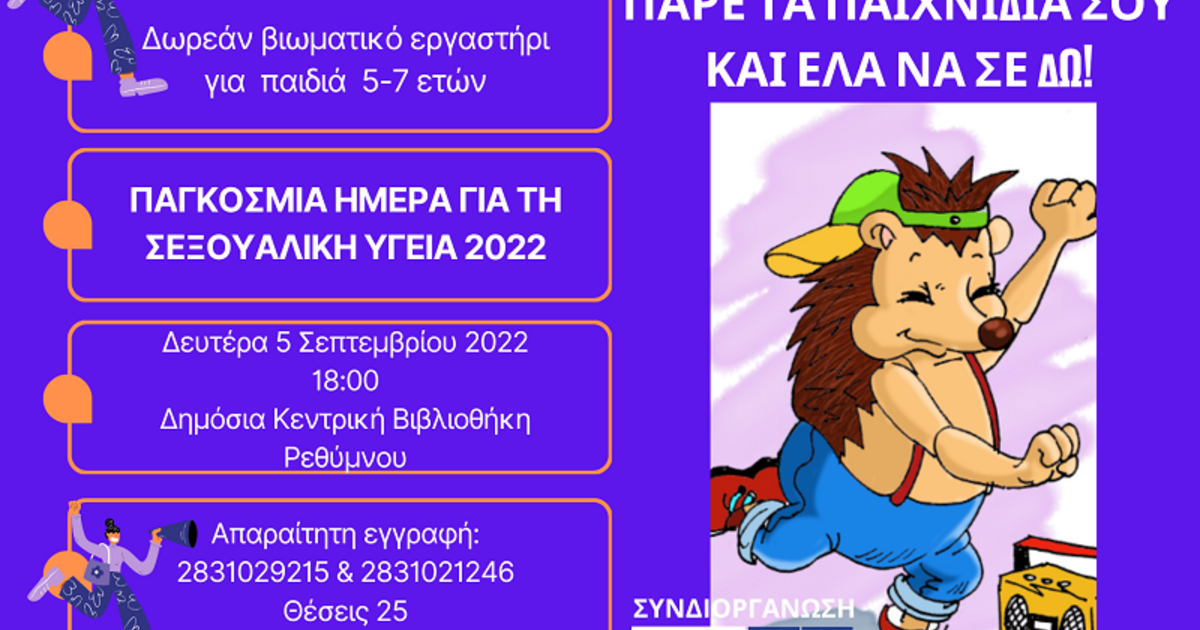 Η Α.ΞΕ.Π.Τ. (Ασφαλή Ξένοιαστα Παιδιά Τώρα) - η βραβευμένη ομάδα του «Φρίξου» - σε συνεργασία με τη Δημόσια Κεντρική Βιβλιοθήκη Ρεθύμνου γιορτάζει την Παγκόσμια Ημέρα Σεξουαλικής Υγείας στο Ρέθυμνο #WSHD22 και ανοίγει τις πόρτες της για μια ακόμα φορά στα μικρά παιδιά που θέλουν να γνωρίσουν τον Φρίξο, τον μικρό σκαντζόχοιρο και ήρωα του εκπαιδευτικού εγχειριδίου «Παίζω με τον Φρίξο και μαθαίνω για το σώμα μου και τις διαπροσωπικές σχέσεις».