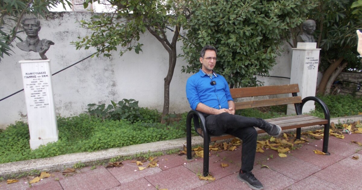 Σ.σ.: Στην κεντρική φωτογραφία, ο ιστορικός Ιάσονας Χανδρινός ανάμεσα στις προτομές του καθηγητή Γιάννη Μαθιουδάκη και του δικηγόρου Γιώργου Γιακουμογιαννάκη μιλάει στην κάμερα για την ιστορία της Κοξαρέ
