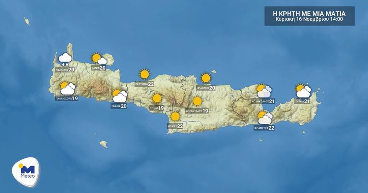 Η θερμοκρασία στην Κρήτη θα κυμανθεί από 8 έως 22 βαθμούς στην Κρήτη.