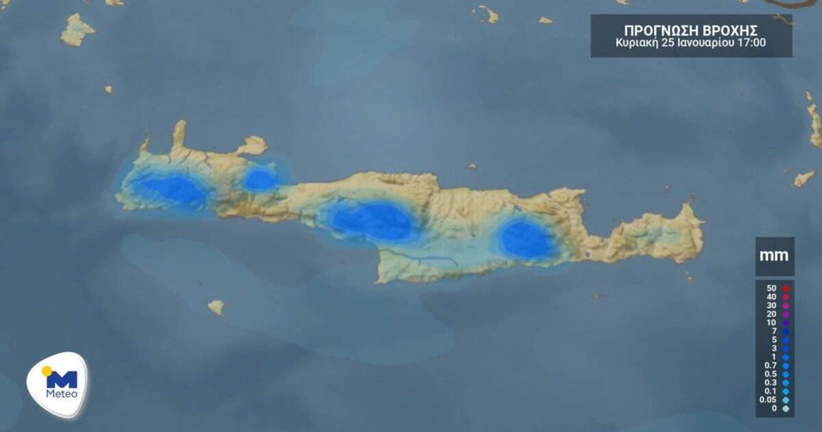 Την Κυριακή 25/01, προβλέπονται νεφώσεις με τοπικές βροχές στην Κρήτη. Σποραδικές καταιγίδες θα αρχίσουν να εκδηλώνονται από το βράδυ στα δυτικά.