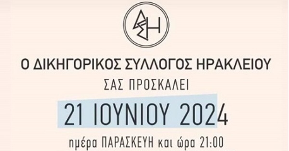 Ο Δικηγορικός Σύλλογος Ηρακλείου διοργανώνει εκδήλωση την Παρασκευή 21 Ιουνίου, στις 9 το βράδυ, στο Κηποθέατρο "Μ. Χατζηδάκις" με τίτλο "Κύκλος Ελλήνων Λογοτεχνών Δικαστών".