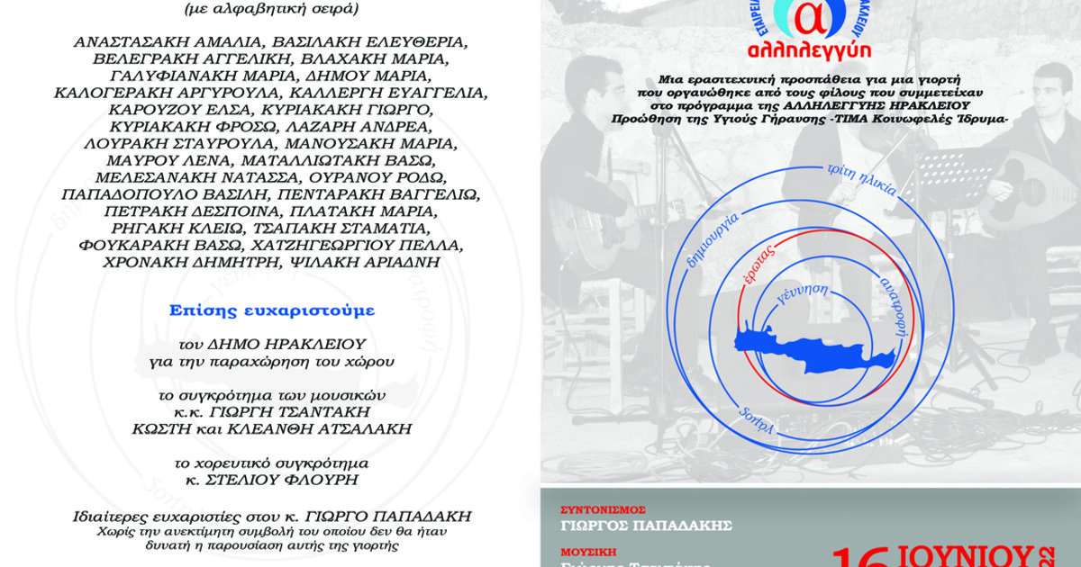 Η ολοκλήρωση του προγράμματος "ΠΡΟΩΘΗΣΗ ΤΗΣ ΥΓΙΟΥΣ ΚΑΙ ΕΝΕΡΓΟΥ ΓΗΡΑΝΣΗΣ" μετά από απόφαση των ίδιων των ωφελούμενων θα παρουσιαστεί με μία γιορτή που οργάνωσαν οι ίδιοι, μια κατάθεση ψυχής "Ο κύκλος της ζωής με μαντινάδες" στο μικρό κηποθέατρο Μάνος Χατζιδάκις την Πέμπτη στις 16 Ιουνίου στις 8.30 το βράδυ!!