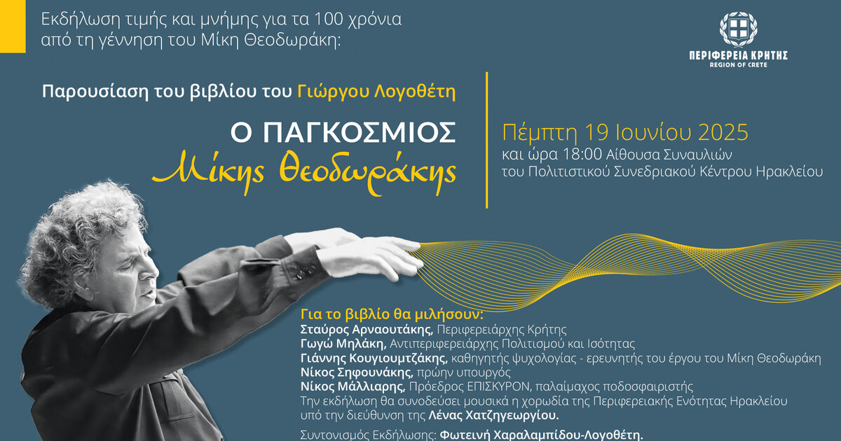 Η Περιφέρεια Κρήτης στο πλαίσιο του εορτασμού για τα 100 χρόνια από τη γέννηση του μεγάλου μουσικό-συνθέτη Μίκη Θεοδωράκη διοργανώνει την Πέμπτη 19 Ιουνίου 2025 και ώρα 6:00μ.μ., στην Αίθουσα Συναυλιών του Πολιτιστικού Συνεδριακού Κέντρου Ηρακλείου, εκδήλωση τιμής και μνήμης, που περιλαμβάνει την παρουσίαση του βιβλίου του Γιώργου Λογοθέτη «Ο Παγκόσμιος Μίκης Θεοδωράκης» που εκδόθηκε με την υποστήριξη της Περιφέρειας Κρήτης. Η εκδήλωση θα είναι ελεύθερη για το κοινό.