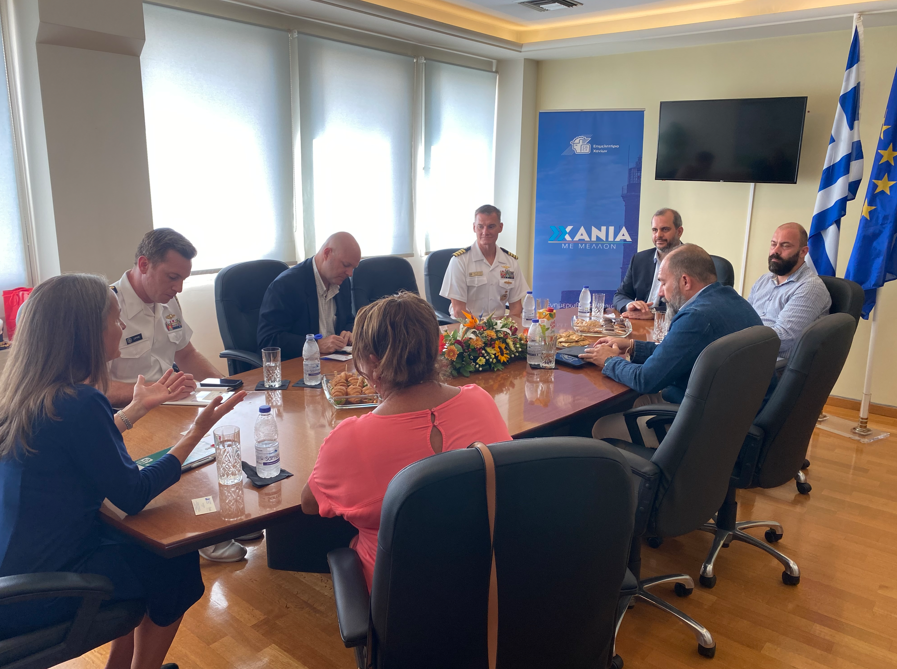 Σήμερα, ο κ. Αντώνης Ροκάκης, Πρόεδρος του Επιμελητηρίου Χανίων, υποδέχτηκε στα γραφεία του θεσμικού φορέα της Επιχειρηματικότητας υψηλόβαθμη αντιπροσωπεία της πρεσβείας των Η.Π.Α. στην Αθήνα με επικεφαλής τη νέα Επιτετραμμένη, κα Maria dG Olson, η οποία συνοδευόταν από τον Γενικό Πρόξενο της πρεσβείας, κ. Benjamin Ousley Naseman, τον Διοικητή της «Αμερικανικής Ναυτικής Ευκολίας της Σούδας», Πλοίαρχο κ. Odin Klug, τον Βοηθό Ναυτικού Ακολούθου της πρεσβείας, Αντιπλοίαρχο κ. Chris Lepore και την Υπεύθυνη Πρωτοκόλλου και Δημοσίων Σχέσεων της Ναυτικής Ευκολίας Σούδας, κα Έφη Παπαδάκη. Από πλευράς της Διοίκησης του Επιμελητηρίου Χανίων, στη σύσκεψη εργασίας συμμετείχαν και ο Γενικός Γραμματέας, κ. Γιώργος Ζυμβραγάκης, όπως και ο Υπεύθυνος Συμβουλευτικής Επιχειρήσεων, κ. Δημήτρης Μουντάκης.