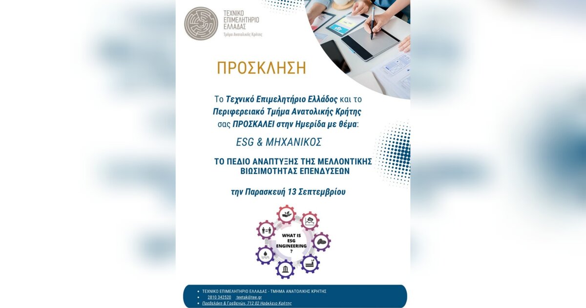 Ημερίδα με θέμα "ESG & MHXANIKOΣ - Το πεδίο Ανάπτυξης της Μελλοντικής Βιωσιμότητας Επενδύσεων" διοργανώνει το Τεχνικό Επιμελητήριο Ελλάδος και το Περιφερειακό Τμήμα Ανατολικής Κρήτης, την Παρασκευή 13 Σεπτεμβρίου, από τις 09.30 το πρωί, στο ΤΕΕ/ΤΑΚ (Πρεβελάκη και Γρεβενών) στο Ηράκλειο.