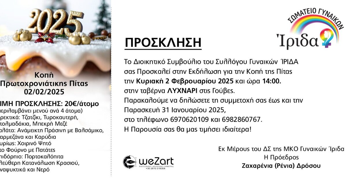 Το Διοικητικό Συμβούλιο του Συλλόγου Γυναικών ΊΡΙΔΑ σας προσκαλεί στην εκδήλωση για την Κοπή της Πίτας την Κυριακή 2 Φεβρουαρίου, 2025 και ώρα 14:00.