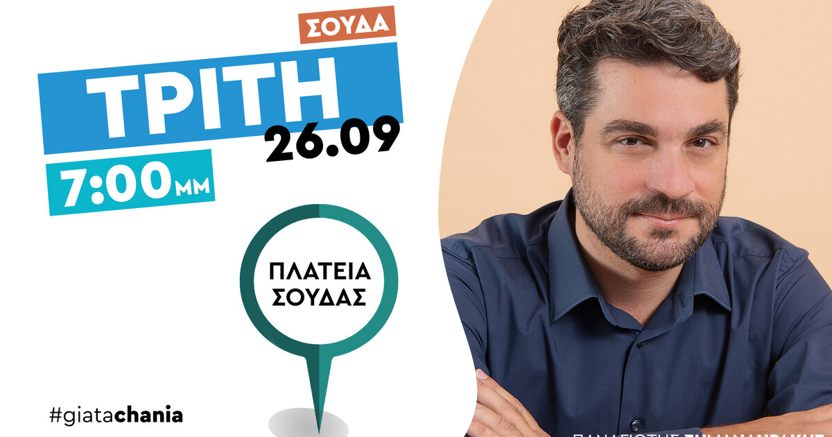 Την Τρίτη 26 Σεπτεμβρίου 2023 το απόγευμα, η ομάδα «Για τα Χανιά» θα βρεθεί στη Σούδα, όπου θα συνομιλήσει με κάτοικους και καταστηματάρχες, ενώ στις 19:00 στην Πλατεία Σούδας θα γίνει ομιλία του Δημάρχου Χανίων και εκ νέου υποψηφίου, Παναγιώτη Σημανδηράκη.