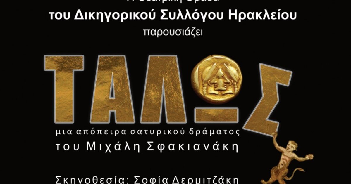 Την Πέμπτη 14 Σεπτεμβρίου 2023 και ώρα 21:30 μ.μ. στο Κηποθέατρο <<Νίκος Καζαντζάκης>> στο Ηράκλειο, η Θεατρική Ομάδα του Δικηγορικού Συλλόγου Ηρακλείου, ανεβάζει το σατυρικό δράμα «ΤΑΛΩΣ», έργο του δικηγόρου Ηρακλείου Μιχάλη Σφακιανάκη, σε σκηνοθεσία Σοφίας Δερμιτζάκη.
