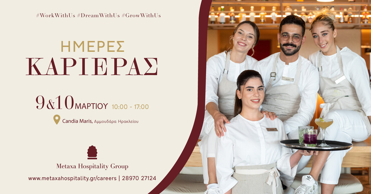 Το Metaxa Hospitality Group προσκαλεί όσους ονειρεύονται να εργαστούν και να εξελιχθούν στην καρδιά της φιλοξενίας στις ανοιχτές «Ημέρες Καριέρας» στις 09 & 10 Μαρτίου στο Ηράκλειο Κρήτης. Με ανοιχτές θέσεις στα βραβευμένα ξενοδοχεία του Ομίλου σε Κρήτη και Σαντορίνη, αυτή είναι η ευκαιρία να διαμορφώσετε το μέλλον σας, λίγο πριν την επίσημη έναρξη της τουριστικής σεζόν.