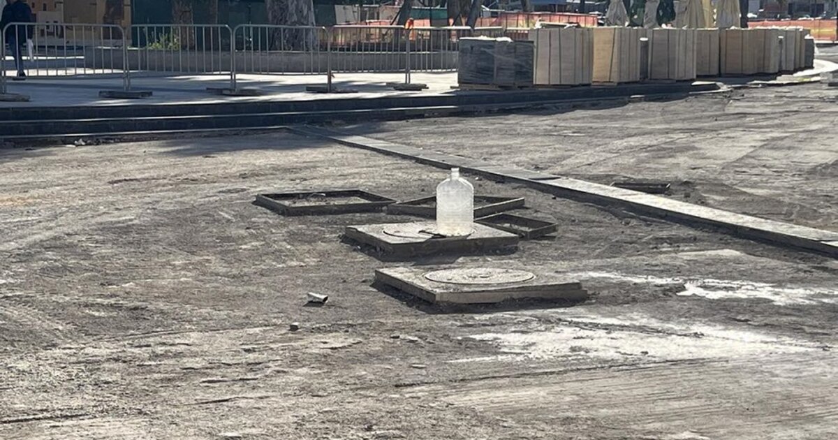 Εργάτης πουθενά. Ένα άδειο μπιτόνι νερού υπενθυμίζει πως σχετικά πρόσφατα κάποιοι δούλευαν εκεί.