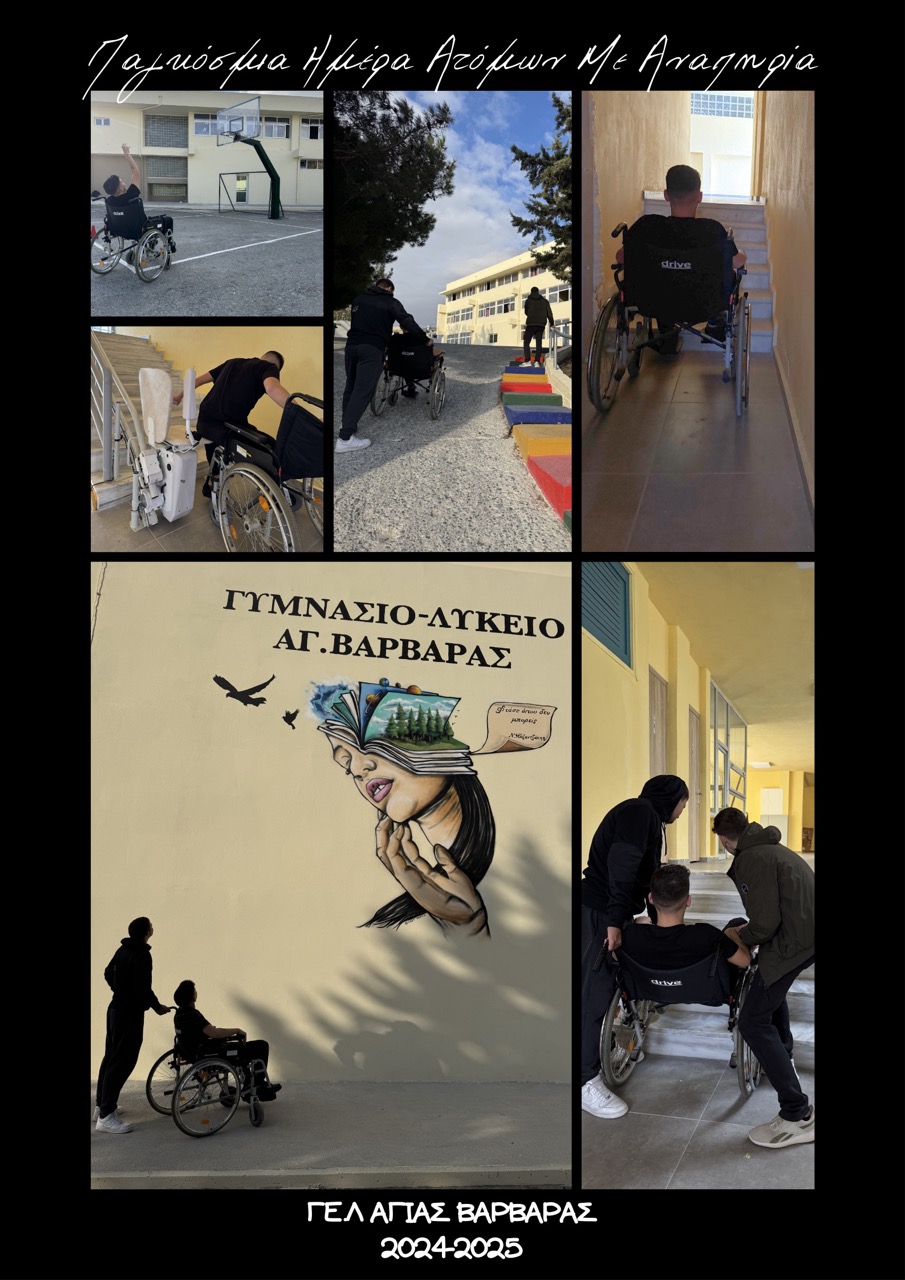 Στο ΓΕΛ Αγίας Βαρβάρας, με τη βοήθεια και το συντονισμό της Διευθύντριας, του Υποδιευθυντή του σχολείου, καθώς και του Συλλόγου Διδασκόντων, υλοποιήθηκαν δράσεις στο πλαίσιο της Διεθνούς Ημέρας Ατόμων με Αναπηρία.