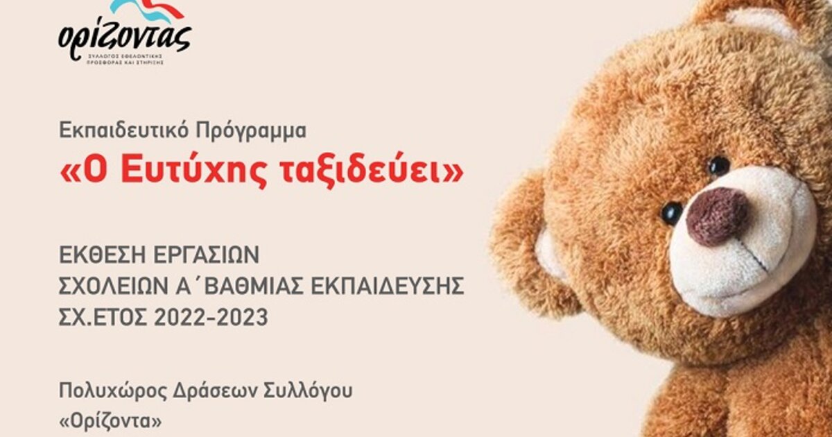 Ο Σύλλογος Εθελοντικής Προσφοράς και Στήριξης «Ορίζοντας» διοργανώνει έκθεση εργασιών των σχολείων της Α’ Βάθμιας Εκπαίδευσης Χανίων, που υλοποίησαν τη σχολική χρονιά 2022-2023 το εγκεκριμένο από το Υπουργείο Παιδείας και Θρησκευμάτων εκπαιδευτικό πρόγραμμα «Ο Ευτύχης ταξιδεύει».