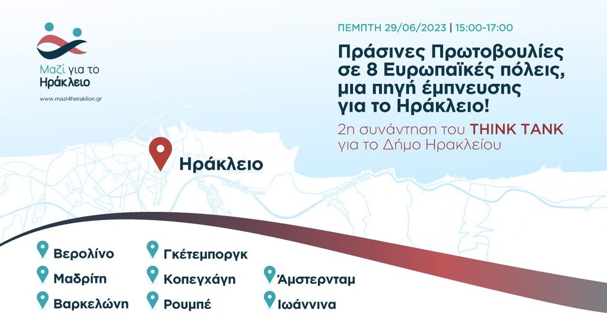 Η δεύτερη συνάντηση του Think Tank, της «δεξαμενής σκέψης και ιδεών» για το Ηράκλειο, θα πραγματοποιηθεί σήμερα Πέμπτη 29 Ιουνίου και ώρα 15.00-17.00 και το θέμα συζήτησης θα είναι "Πράσινες Πρωτοβουλίες σε 8 Ευρωπαϊκές πόλεις, Μια πηγή έμπνευσης για το Ηράκλειο!".