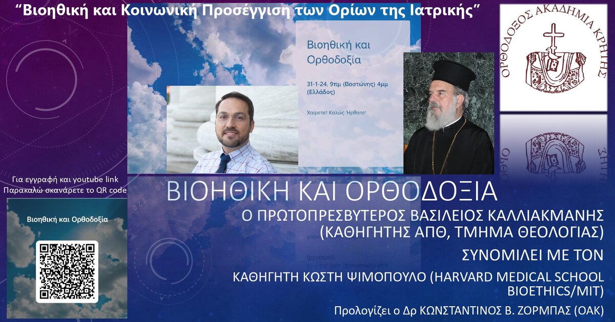 Η Ορθόδοξος Ακαδημία Κρήτης, ως Ερευνητικό Κέντρο, και σε συνεργασία με την Ιατρική Σχολή του Πανεπιστημίου Harvard (Τμήμα Παγκόσμιας Υγείας και Κοινωνικής Ιατρικής) άρχισε σειρά επιστημονικών διαλέξεων, με κεντρικό θέμα: «Βιοηθική και Ορθοδοξία». Στην πρώτη συνάντηση κεντρικός ομιλητής ήταν ο Δρ Μανόλης Κέλλης, Καθηγητής του ΜΙΤ Βοστώνης, ενώ η δεύτερη συνάντηση, με αφορμή την εορτή των Τριών Ιεραρχών, εορτή της Παιδείας, θα πραγματοποιηθεί εκδήλωση την Τετάρτη 31 Ιανουαρίου τ.έ. (16:00-18:00) και εισηγητή τον π. Βασίλειο Καλλιακμάνη, Καθηγητή της Θεολογικής Σχολής του Πανεπιστημίου Θεσσαλονίκης.