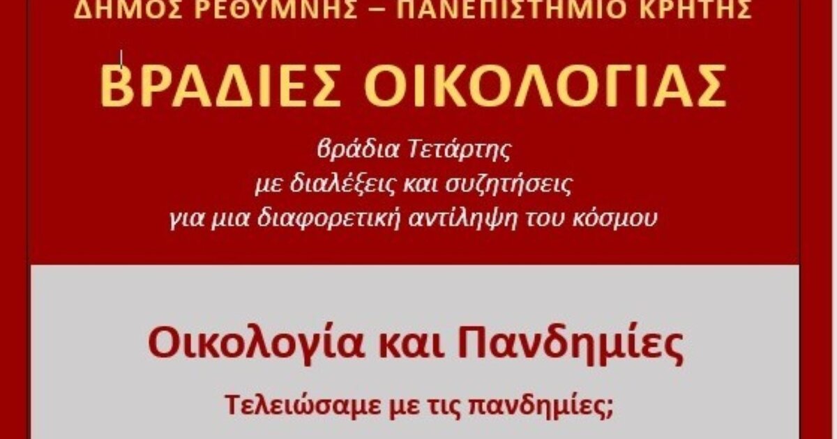 «Οικολογία και Πανδημίες» στις «Βραδιές Οικολογίας» που συνδιοργανώνουν ο Δήμος Ρεθύμνης και το Πανεπιστήμιο Κρήτης