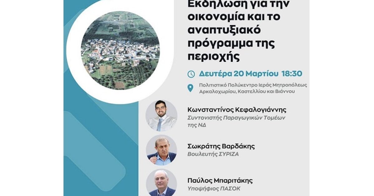 Τη Δευτέρα 20 Μαρτίου στις 18.30 στο Αρκαλοχώρι στο Πολιτιστικό Πολύκεντρο της Ιεράς Μητρόπολης θα πραγματοποιηθεί μία πολύ ενδιαφέρουσα εκδήλωση με θέμα την Οικονομία και το Αναπτυξιακό Πρόγραμμα για την πληγείσα από το σεισμό περιοχή.