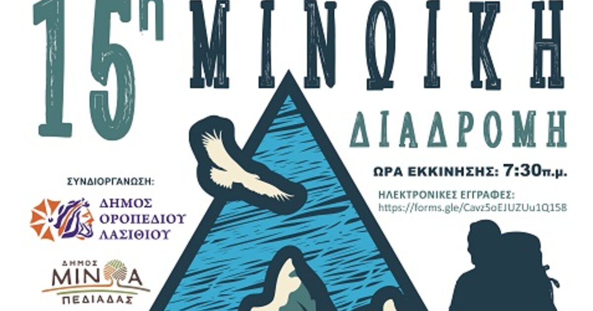 Λίγες μέρες έμειναν για τη 15η Μινωική Διαδρομή που διοργανώνουν την Κυριακή 22 Σεπτεμβρίου ο Δήμος Μινώα Πεδιάδας και ο Δήμος Οροπεδίου Λασιθίου, με την υποστήριξη των Πολιτιστικών Συλλόγων Ψυχρού “Ο Ξένιος Ζευς”, Λύττου «Η Αρχαία Λύκτος», του Σωματείου «Φίλοι Αρχαίας Λύκτου», του Μορφωτικού Εξωραϊστικού Συλλόγου Κασταμονίτσας, του Πολιτιστικού Συλλόγου Καστελλίου και της Ομάδας Διαχείρισης Ανθρωπιστικών Κρίσεων "ΕΠΙΔΡΑΣΙΣ".