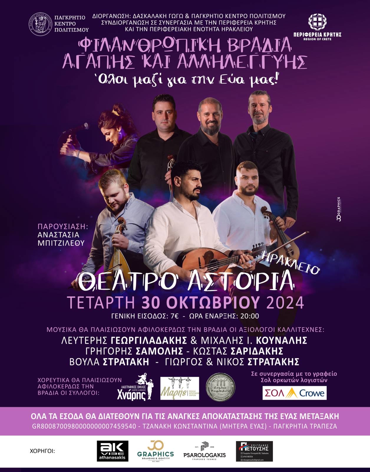 Η Βραδιά θα πραγματοποιηθεί την Τέταρτη 30 Οκτωβρίου 2024 στην αίθουσα κινηματογράφου ΑΣΤΟΡΙΑ στο Ηράκλειο και θα την στηρίξουν μουσικά και αφιλοκερδώς οι παρακάτω αξιόλογοι κρητικοί καλλιτέχνες με αλφαβητική σειρά.