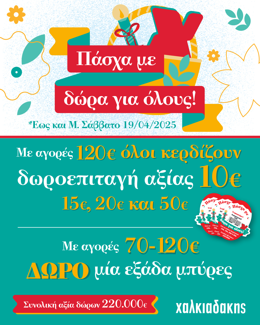 Μέχρι και το Μεγάλο Σάββατο, για κάθε 120€ αγορών σε μία απόδειξη, όλοι κερδίζουν αυτόματα δωροεπιταγή αξίας 10€ ή και μεγαλύτερης αξίας 15€, 20€ ή και 50€ για τις επόμενες αγορές τους. Επιπλέον, για αγορές από 70€ ως και τα 120€, τα super markets Χαλκιαδάκης μας κερνούν μια εξάδα μπύρες για να απολαύσουμε όλοι μαζί στο γιορτινό τραπέζι.