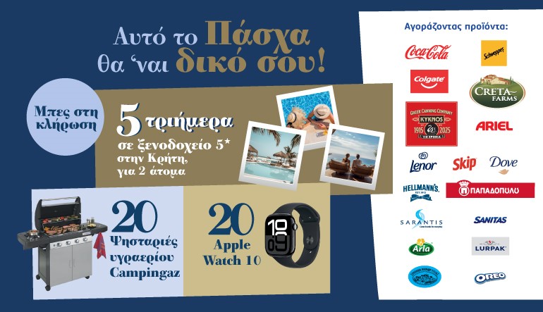 Η κλήρωση θα πραγματοποιηθεί την Δευτέρα 19.05.25! Τα προϊόντα που συμμετέχουν στην κλήρωση είναι CRETA FARMS εν ελλάδι, LURPAK, HELLMANN'S, Knorr, Arla, ΠΑΠΑΔΟΠΟΥΛΟΥ, Merenda, Oreo, ΠΑΥΛΙΔΗΣ, PHILADELPHIA, KYKNOS, Coca Cola, Schweppes ή Αmita FREE, bioten, Carroten, Noxzema, ORZENE, SANITAS, Tesori, AVA, Skip,OMO, Cajoline, KLINEX, Dove, ULTREX, AXE, AIM, CIF, LUX, VASELINE,TRESEMME, PerioGard, Colgate, PALMOLIVE, Sanex, Soupline, AJAX, ARIEL και Lenor