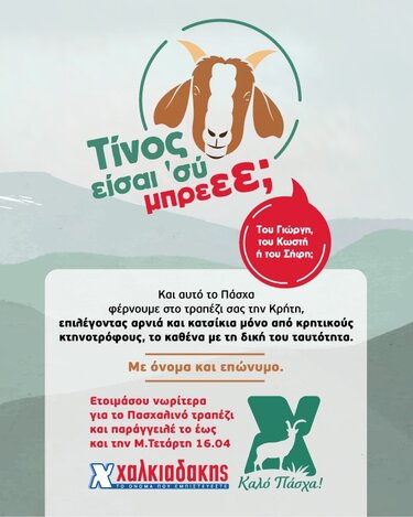 Και αυτό το Πάσχα φροντίζουμε να γνωρίζετε… τίνος είναι τα αρνιά και τα κατσίκια που θα βρείτε στα κρεοπωλεία μας. Έχουν όλα κρητικό ονοματεπώνυμο και τα φέρνουμε στο τραπέζι σας.