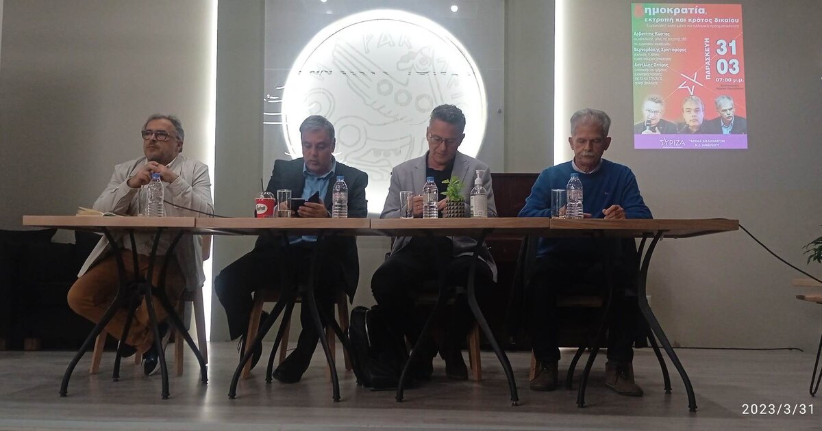 Με μεγάλη επιτυχία τόσο από την αθρόα συμμετοχή, όσο και για το κλίμα που επικράτησε, πραγματοποιήθηκε χτες Παρασκευή 31 Μαρτίου 2023, η ανοικτή εκδήλωση- συζήτηση που διοργάνωσε η θεματική δικαιωμάτων της ΝΕ Ηρακλείου του ΣΥΡΙΖΑ-ΠΣ με θέμα: «Δημοκρατία, Εκτροπή και Κράτος Δικαίου: Ευρωπαϊκό κεκτημένο και ελληνική πραγματικότητα», με εισηγητές τους: Κώστα Αρβανίτη, Ευρωβουλευτή ΣΥΡΙΖΑ-ΠΣ, μέλος της επιτροπής LIBE του Ευρωπαϊκού κοινοβουλίου, Χριστόφορο Βερναρδάκη, βουλευτή Α΄ Αθήνας, πρώην υπουργό Επικρατείας και Σπύρο Δανέλλη, συντονιστή του Τμήματος Ευρωπαϊκής πολιτικής της ΚΕ του ΣΥΡΙΖΑ-ΠΣ, πρώην βουλευτή.