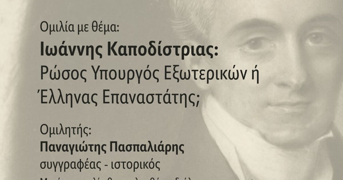 «Την Τετάρτη 2 Απριλίου και ώρα 19:00, θα πραγματοποιηθεί η ομιλία με θέμα : “Ιωάννης Καποδίστριας: Ρώσος Υπουργός Εξωτερικών ή Έλληνας Επαναστάτης;” στο αμφιθέατρο της ΟΑΚ, στο Κολυμπάρι με καλεσμένο κεντρικό ομιλητή τον κ. Παναγιώτη Πασπαλιάρη, συγγραφέα-ιστορικό.