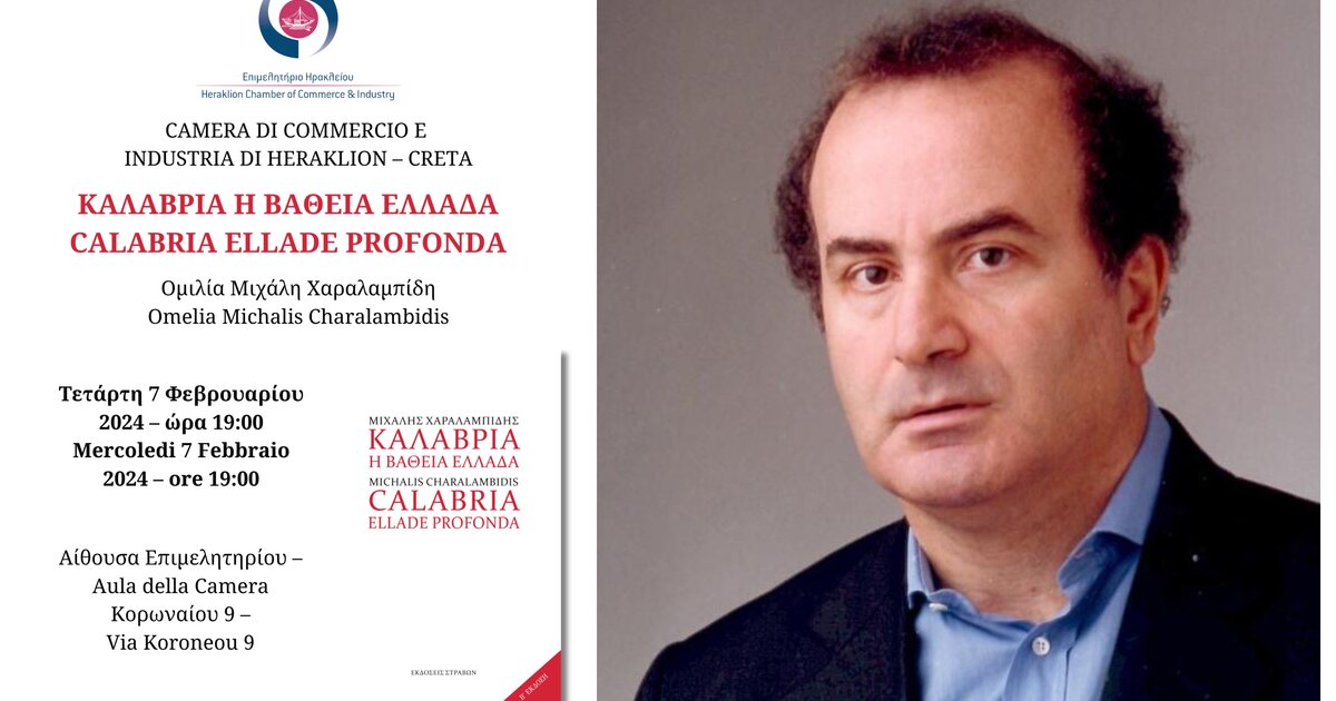 Ομιλία με θέμα «ΚΑΛΑΒΡΙΑ, Η ΒΑΘΕΙΑ ΕΛΛΑΔΑ» του πολιτικού κοινωνιολόγου και συγγραφέα Μιχάλη Χαραλαμπίδη πραγματοποιείται στο Επιμελητήριο Ηρακλείου, την Τετάρτη 07/02/2024 και ώρα 19:00 μ.μ.