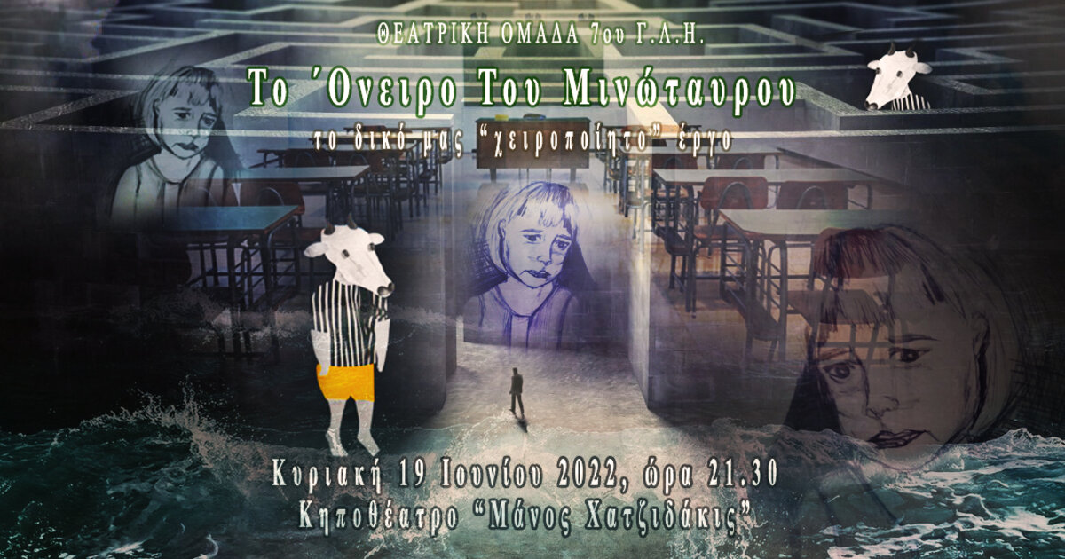 Η θεατρική ομάδα του 7ου Γενικού Λυκείου Ηρακλείου, παρουσιάζει την παράσταση "Το όνειρο του Μινώταυρου" την Κυριακή 19 Ιουνίου 2022, ώρα 21:30 στο Κηποθέατρο «Μάνος Χατζιδάκις».