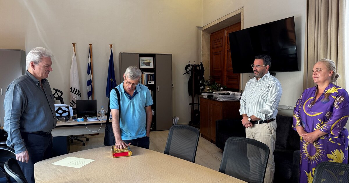 Πραγματοποιήθηκε από το Δήμαρχο Ηρακλείου Αλέξη Καλοκαιρινό η ορκωμοσία ενός νέου μόνιμου Δημοτικού Υπαλλήλου, παρουσία των αρμόδιων Αντιδημάρχων Τεχνικών Υποδομών και Βιώσιμης Κινητικότητας Γιώργου Σισαμάκη και Αποκέντρωσης & Ανάπτυξης της Υπαίθρου Γιάννας Καλονάκη, το πρωί της Δευτέρας 15/9 στη Λότζια.