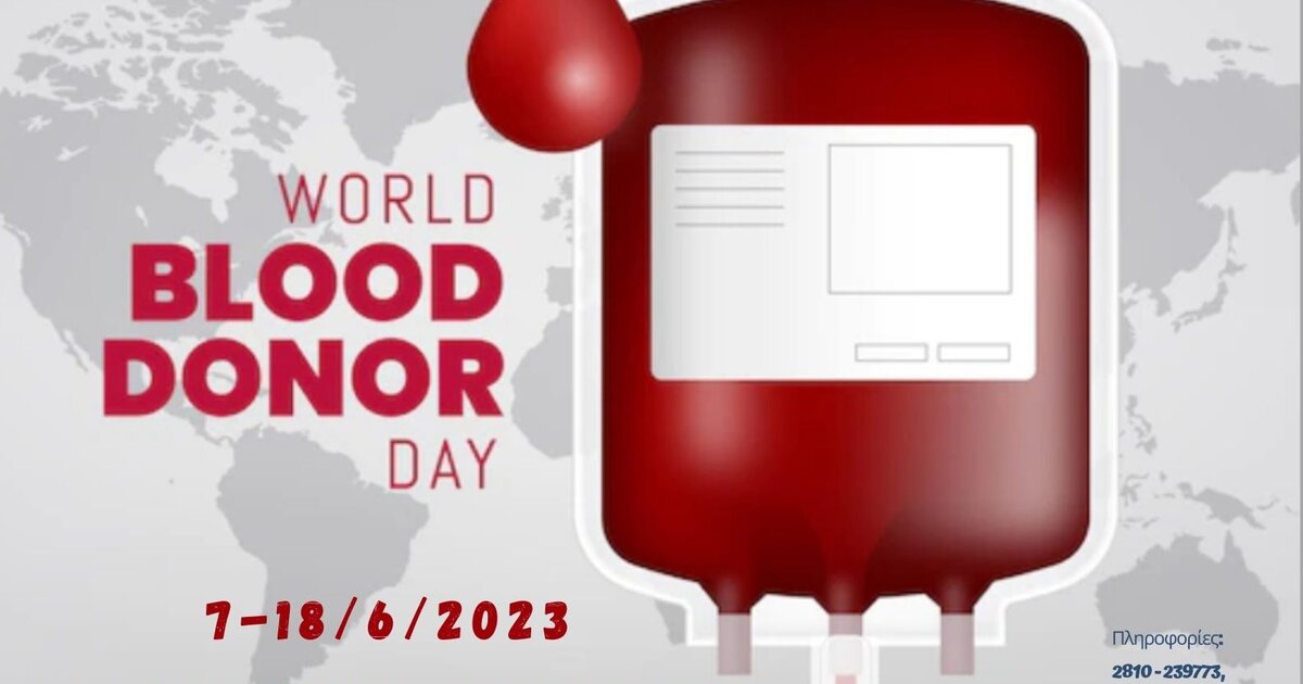 Με αφορμή την Παγκόσμια Ημέρα Εθελοντή Αιμοδότη-2023 ο Παγκρήτιος Σύνδεσμος Εθελοντών Αιμοδοτών και Δωρητών Οργάνων Σώματος «Αιματοκρήτης» και η 7Η Υγειονομική Περιφέρεια Κρήτης, σε συνεργασία οργανισμών και φορέων διοργανώνουν μια σειρά από εθελοντικές αιμοδοσίες, ενημερωτικές και εορταστικές δράσεις για το 12ημερο, από τις 7 έως τις 18 Ιουνίου 2023.