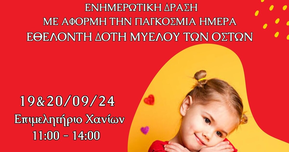 Ο Σύλλογος «Ορίζοντας» σε συνεργασία με το Εμπορικό και Βιομηχανικό Επιμελητήριο Χανίων (στο πλαίσιο του Προγράμματος Κοινωνικής Υπευθυνότητας “Χανιά - Αλληλεγγύη με Μέλλον”) και το ΚΕΔΜΟΠ «Χάρισε Ζωή» διοργανώνουν ενημερωτική δράση με αφορμή την Παγκόσμια Ημέρα Εθελοντή Δότη Μυελού των Οστών.