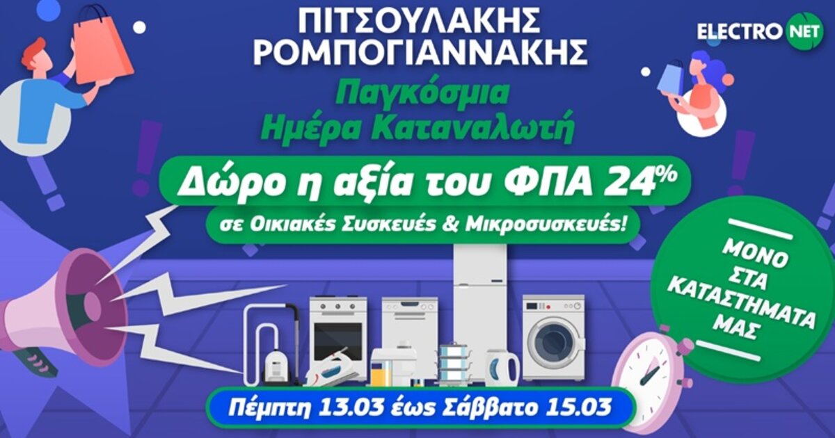 Παγκόσμια Ημέρα Καταναλωτή στα καταστήματα Πιτσουλάκης Ρομπογιαννάκης με ΔΩΡΟ το ΦΠΑ