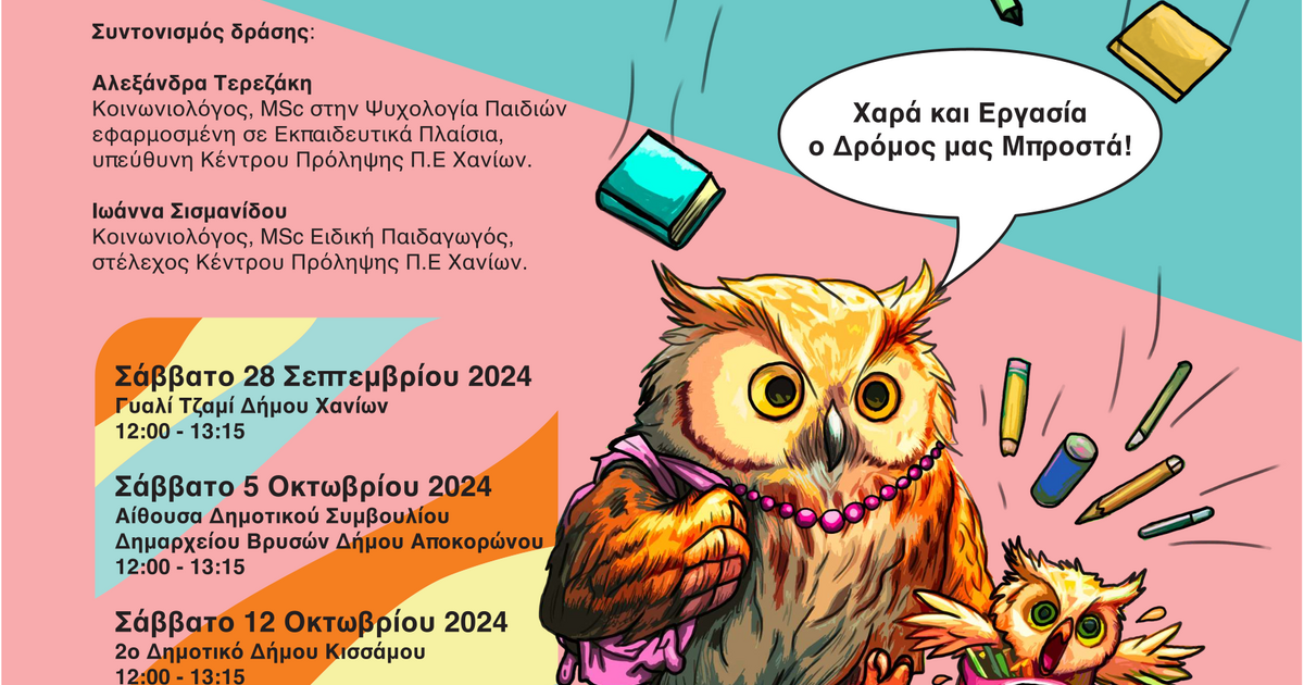 Ένα παιδικό εργαστήρι για την καλή προσαρμογή στο σχολείο για παιδιά Νηπιαγωγείου, Α & Β Δημοτικού. Το εργαστήρι θα πραγματοποιηθεί το Σάββατο 12 Οκτωβρίου, ώρα 12:00 – 13:15 στο 2ο Δημοτικό Σχολείο Κισσάμου.
