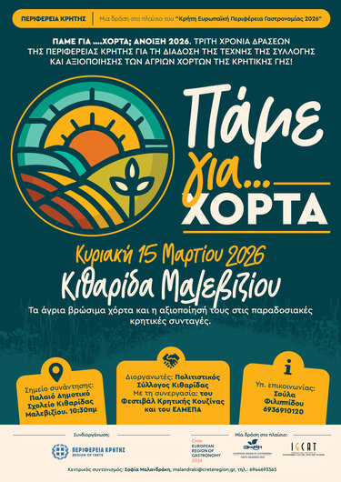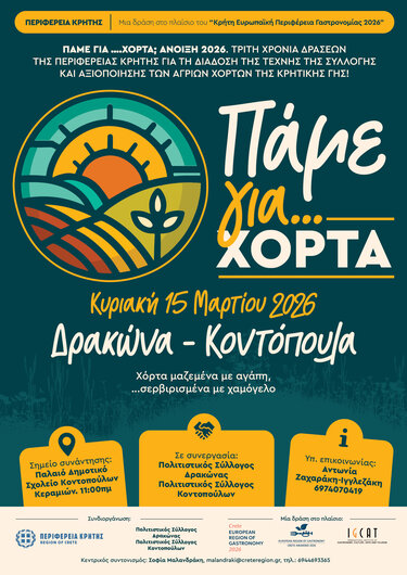 Σας στέλνω προς δημοσιοποιίηση ενημερωτικό υλικό σχετικά με το πρόγραμμα «ΠΑΜΕ ΓΙΑ ….ΧΟΡΤΑ; ΑΝΟΙΞΗ 2026», για τη διάδοση της τέχνης της συλλογής και αξιοποίησης των άγριων χόρτων της κρητικής γης, μαζί με τις αφίσες που αφορούν στις δράσεις της 14 Μαρτίου (Πεμόνια - Παïδοχώρι) και 15 Μαρτίου (Κιθαρίδα Μαλεβιζίου & Δρακώνα)