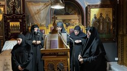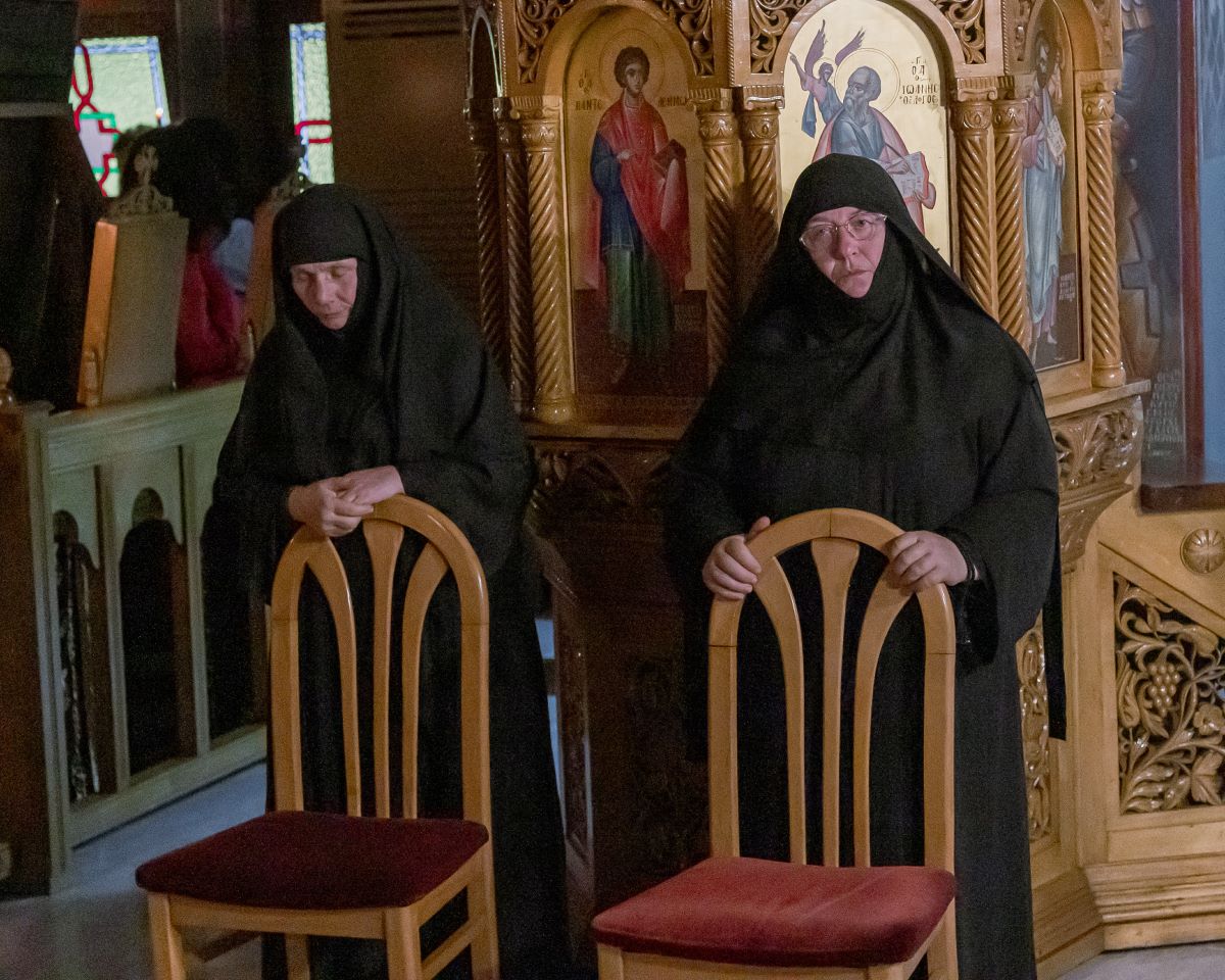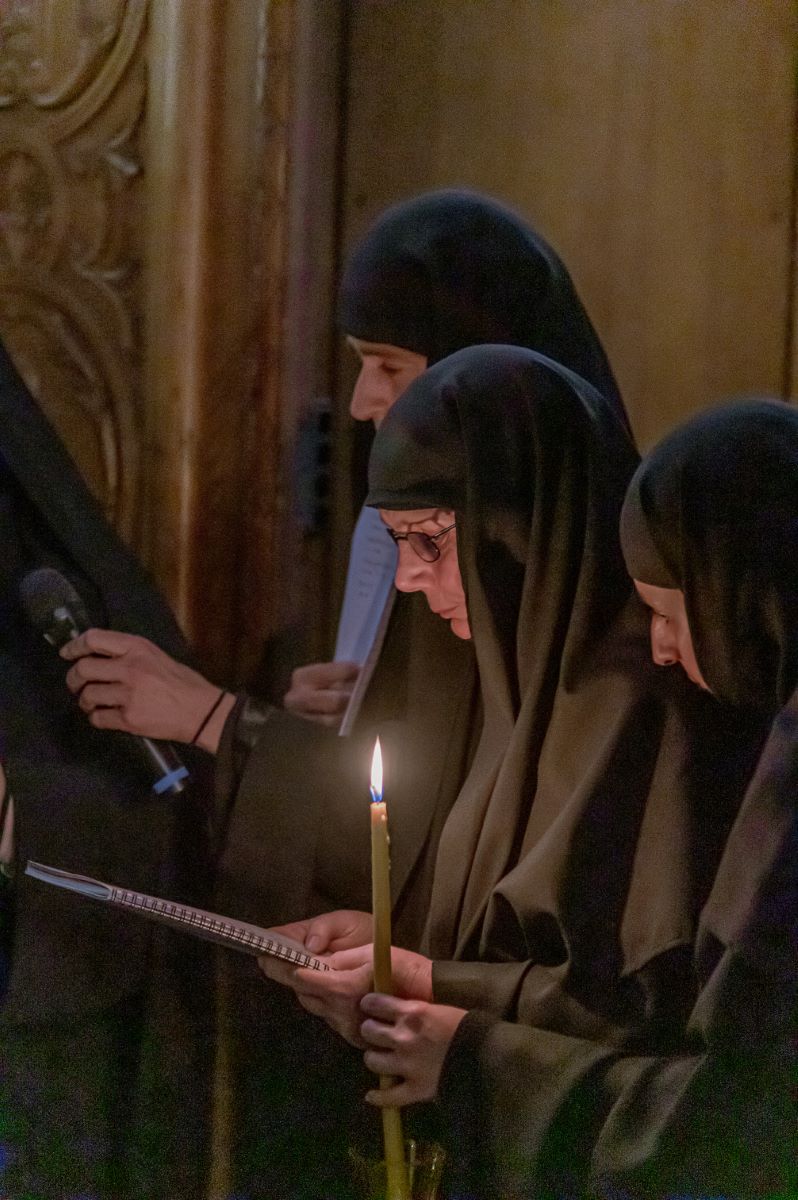 Τους δύο ιεροψαλτικούς χορούς πλαισίωσαν οι Μοναχές από τις γυναικείες Αδελφότητες των Ιερών Μονών Μεταμορφώσεως του Σωτήρος Χριστού Κουμπέ και Αγίας Ειρήνης Ρεθύμνης, συνευχομένων και των Γεροντισσών Μαριάμ και Θέκλας, αντιστοίχως.