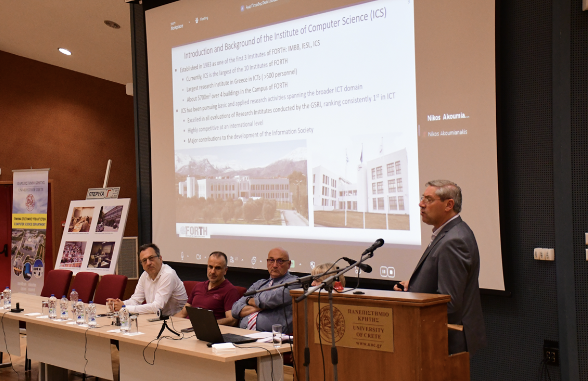 Ακολούθησε καλωσόρισμα και παρουσίαση “Το CSD σήμερα” που απηύθυνε ο Πρόεδρος του Τμήματος, Καθηγητής Κώστας Μαγκούτης. Στην παρουσίασή του ο κ. Μαγκούτης αναφέρθηκε στο προσωπικό και τις υποδομές του Τμήματος, την ακαδημαϊκή και ερευνητική δραστηριότητα των μελών του τα τελευταία 40 χρόνια, την κορυφαία κατάταξή του σε εξωτερικές αξιολογήσεις, τις δραστηριότητες διασύνδεσης που προσφέρει για τους φοιτητές σήμερα, όπως το Career Fair, την εξέλιξη των αποφοίτων του, και το οικοσύστημα έρευνας και καινοτομίας στο οποίο συμμετέχει και αλληλεπιδρά με το Ινστιτούτο Πληροφορικής του ΙΤΕ.