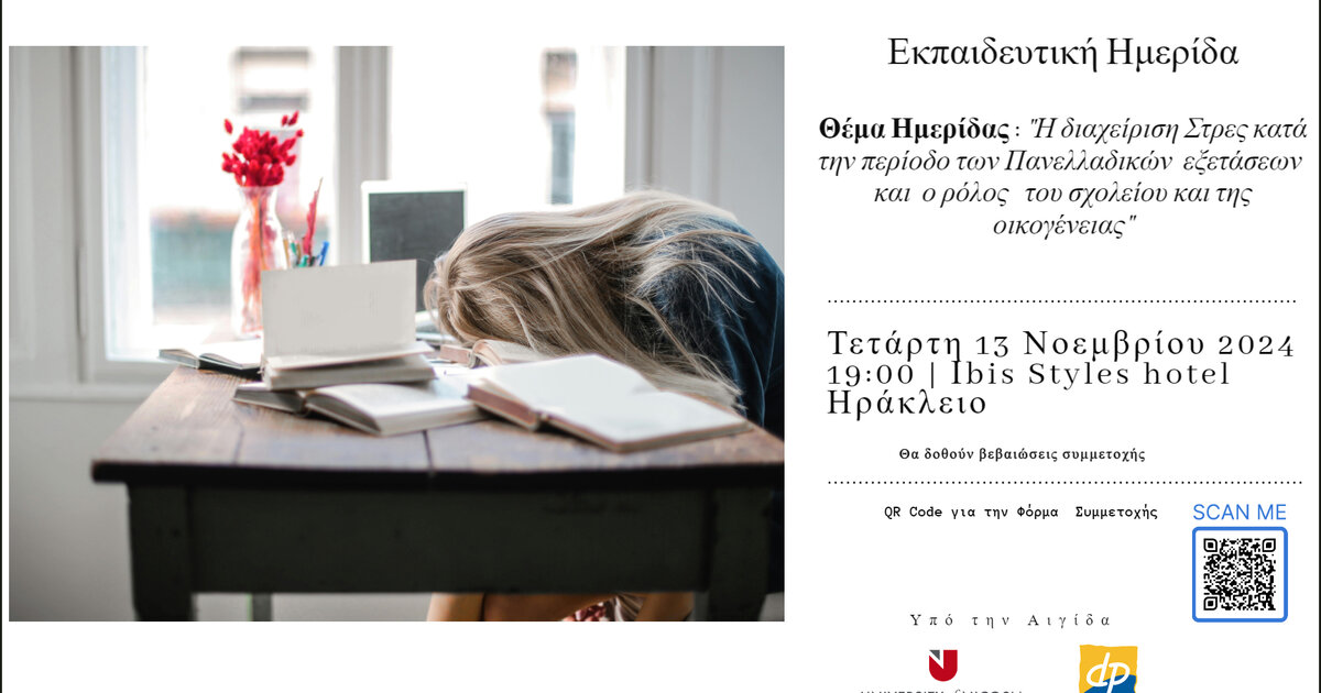 Το Πανεπιστήμιο Λευκωσίας και ο Εκπαιδευτικός Όμιλος dp studies σας προσκαλούν στην εκπαιδευτική ημερίδα με θέμα «Η Διαχείριση Στρες κατά την Περίοδο των Πανελλαδικών Εξετάσεων και ο Ρόλος του Σχολείου και της Οικογένειας», η οποία θα πραγματοποιηθεί την Τετάρτη, 13 Νοεμβρίου 2024, στις 19:00, στο Ibis Styles Hotel Ηράκλειο.