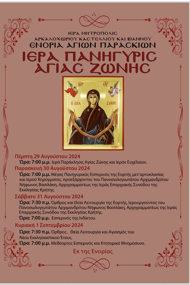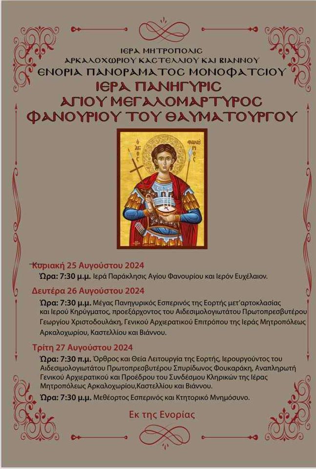 Πανηγυρίζουν δύο μεγάλες Ενορίες του Ηρακλείου, Πανοράματος Μονοφατσίου και Αγίων Παρασκιών, τις ερχόμενες ημέρες και σας καλούν να συμμετάσχετε.