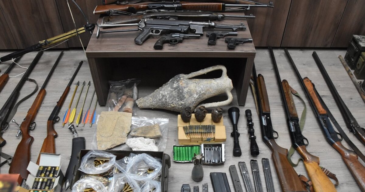 Οι αστυνομικοί δεν πίστευαν στα μάτια τους αντικρίζοντας από πολεμικά τουφέκια, πιστόλια και κυνηγετικά όπλα μέχρι χειροβοβίδες, πυροκροτητές και χιλιάδες σφαίρες, μεταξύ άλλων. Παράλληλα, εντοπίστηκαν δεκάδες κροτίδες αλλά και ένας πήλινος αμφορέας με αρκετά πήλινα και λίθινα κομμάτια άγνωστης περιόδου.