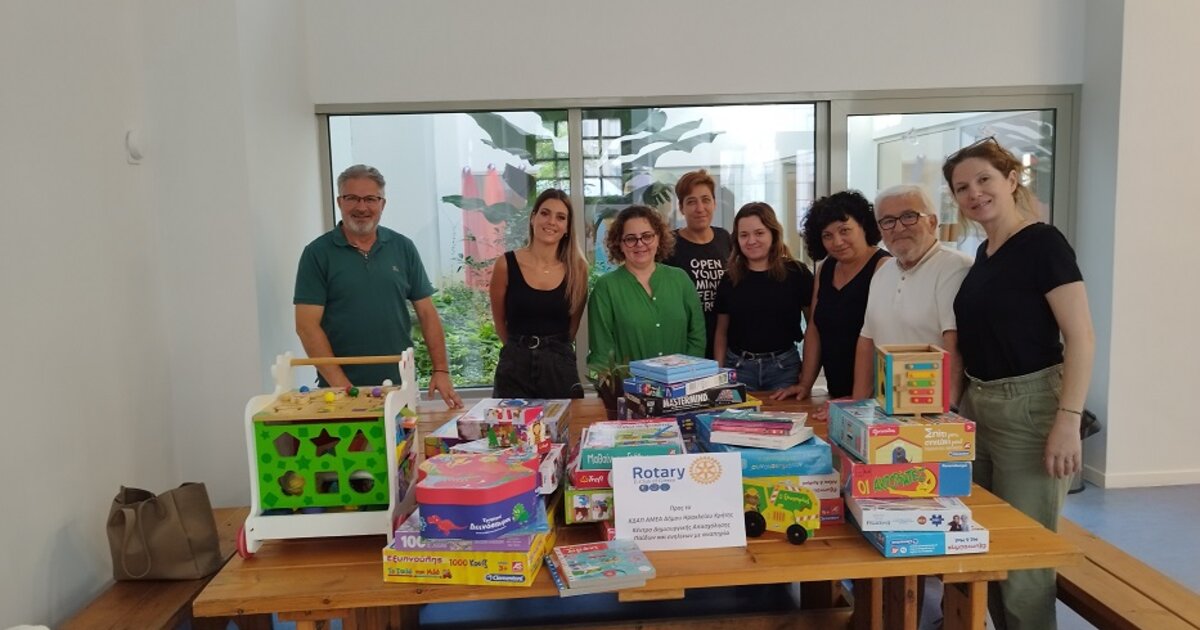 Στα πλαίσιο αυτό, παραδόθηκαν για την κάλυψη των εκπαιδευτικών αναγκών του νέου Κέντρου Δημιουργικής Απασχόλησης για παιδιά και ενήλικες από το μέλος του Ηλεκτρονικού Ροταριανού Ομίλου Ελλάδας κ. Δημοσθένη Μαράκη, εκπαιδευτικά βιβλία δημιουργικής απασχόλησης, παζλς και επιτραπέζια παιχνίδια δεξιοτήτων.