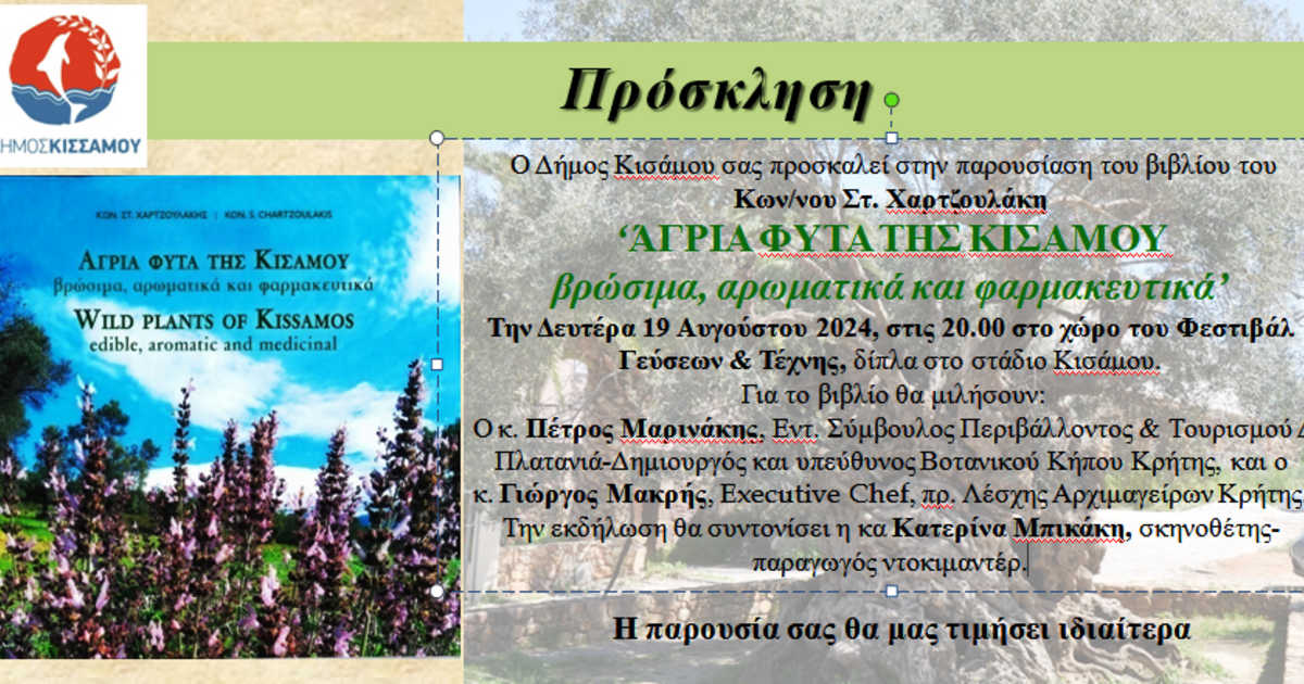 Ο Δήμος Κισσάμου προσκαλεί τον κόσμο στην παρουσιαση του βιβλίου του Κωνσταντίνου Στ. Χαρτζουλάκη