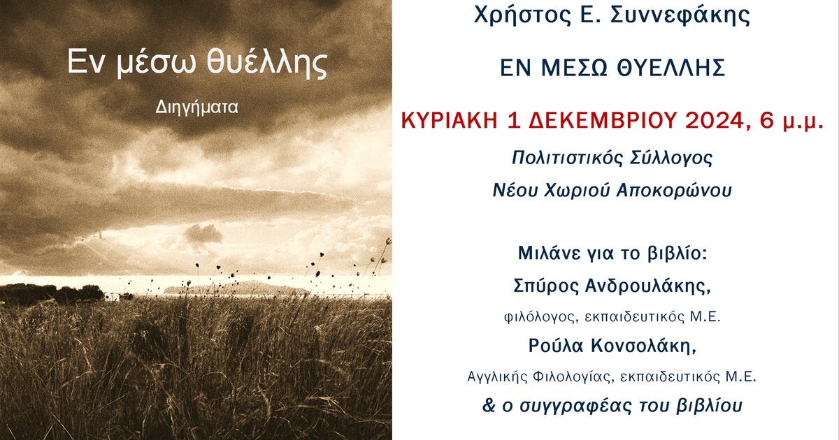 Ο Πολιτιστικός Σύλλογος Νέου Χωριού Αποκορώνου και οι Εκδόσεις Ραδάμανθυς, σας προσκαλούν στην παρουσίαση της συλλογής διηγημάτων του Χρήστου Ε. Συννεφάκη, με τίτλο «Εν μέσω θυέλλης», την Κυριακή 1 Δεκεμβρίου 2024, στις 6 το απόγευμα, στην αίθουσα του πολιτιστικού συλλόγου.