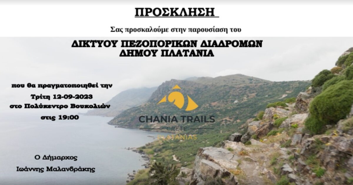 Ο Δήμος Πλατανιά σε συνεργασία με την Περιφέρεια Κρήτης, διοργανώνει την Τρίτη 12 Σεπτεμβρίου και ώρα 19:00μ.μ., στο Πολύκεντρο Βουκολιών, την παρουσίαση του “Δικτύου Πεζοπορικών Διαδρομών” του Δήμου Πλατανιά.