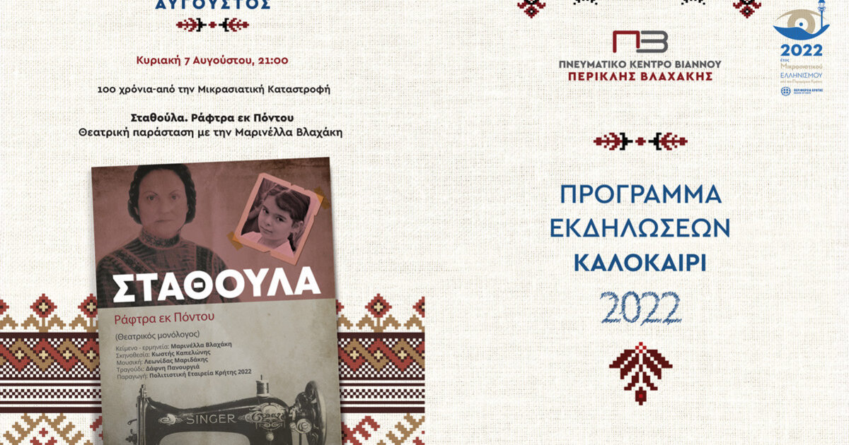 Το Πνευματικό Κέντρο Βιάννου «Περικλής Βλαχάκης», την Κυριακή 7 Αυγούστου στις 21.00 στη Βιάννο, στο πλαίσιο των καλοκαιρινών του εκδηλώσεων, παρουσιάζει τον θεατρικό μονόλογο της Μαρινέλλα Βλαχάκη «ΣΤΑΘΟΥΛΑ, Ράφτρα εκ Πόντου»